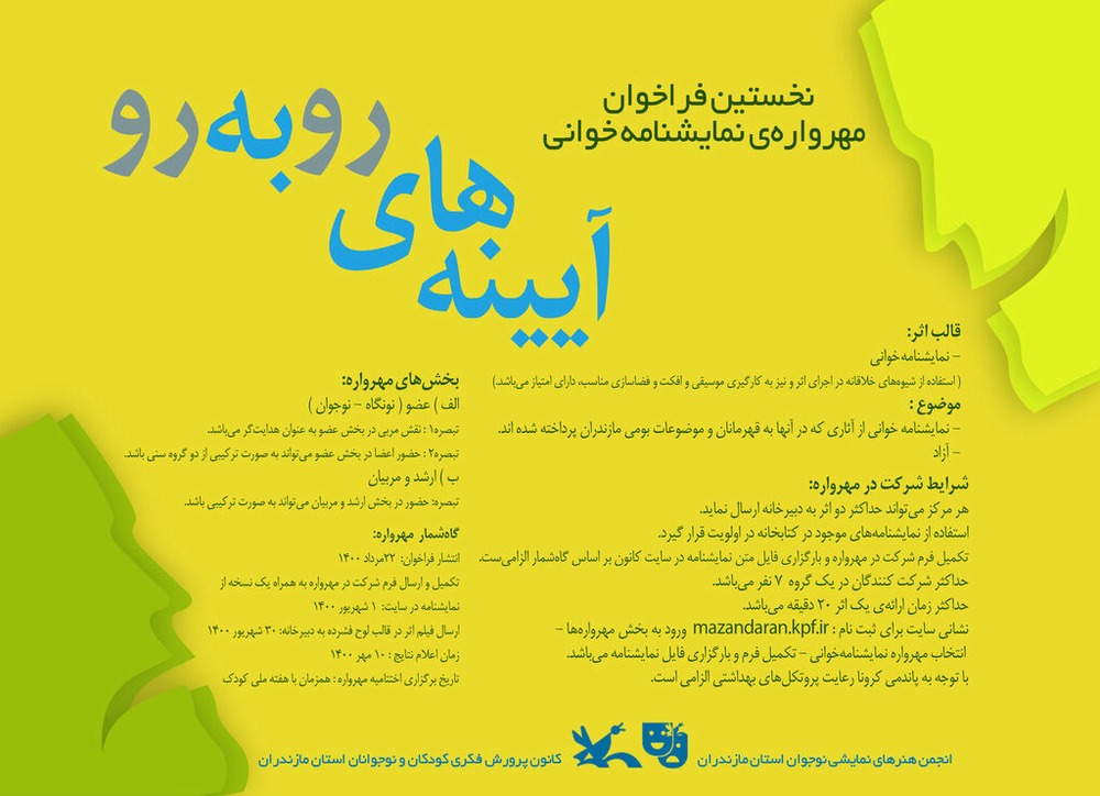 انجمن هنرهای نمایشی کانون پرورش فکری مازندران فراخوان اولین مهرواره نمایشنامهخوانی« آیینههای رو به رو» را منتشر کرد.